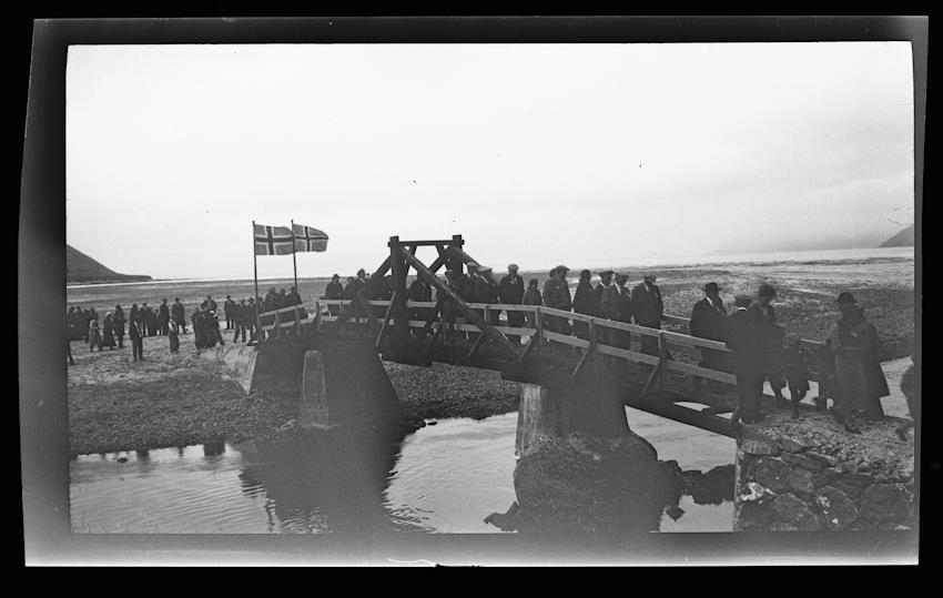 42.Vaðallinn. Örlygshöfn. Rauðasandshreppur. Hópur fólks á trébrú sem hvílir á steyptum stöpli auk landstólpa. Tveir fánar blakta við annan brúarendann Sér til sjávar. Brúarvígsla á göngubrú. Brúin var yfir Vaðalinn við Hóla undir Hafnarmúla. Sparisjóður Rauðasandshrepps gaf þessa brú á 30 ára afmæli sínu. 1934.