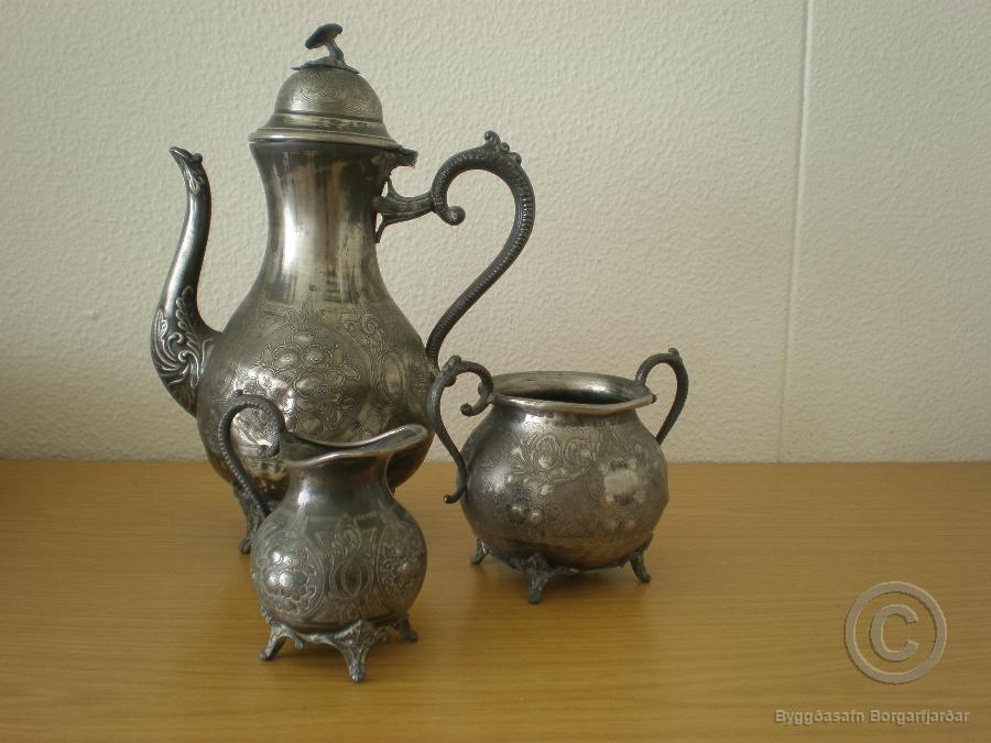 Mjólkurkanna úr þriggja muna setti. Hæð: 10 cm. Aðrir munir í settinu eru Kaffikanna og sykurkar, nr. 9648 og 9650. Úr eigu Þorsteins Þorsteinssonar (1884-1961) frá Arnbjargarlæk (sýslumanns í Dölum lengi vel).Sigríður Gísladóttir, frænka gefanda (kona úr Vestmannaeyjum) hafði keypt munina á uppboði og vildi endilega að Rúnar fengi þá á sínum tíma af því hann gegndi sýslumannsebætti eins og fyrri eigandi.