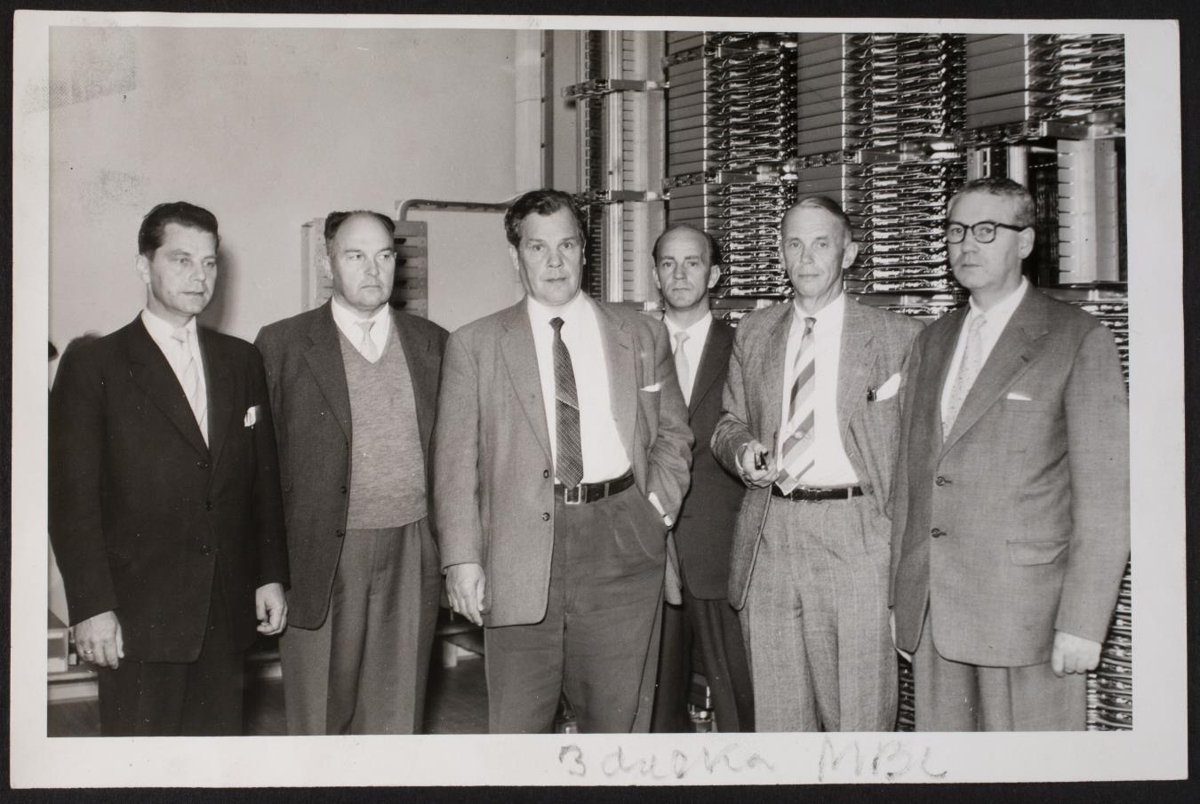 sjálfvirku stöðvarinnar og lengst til vinstri er Jón Skúlason yfirverkfræðingur“.