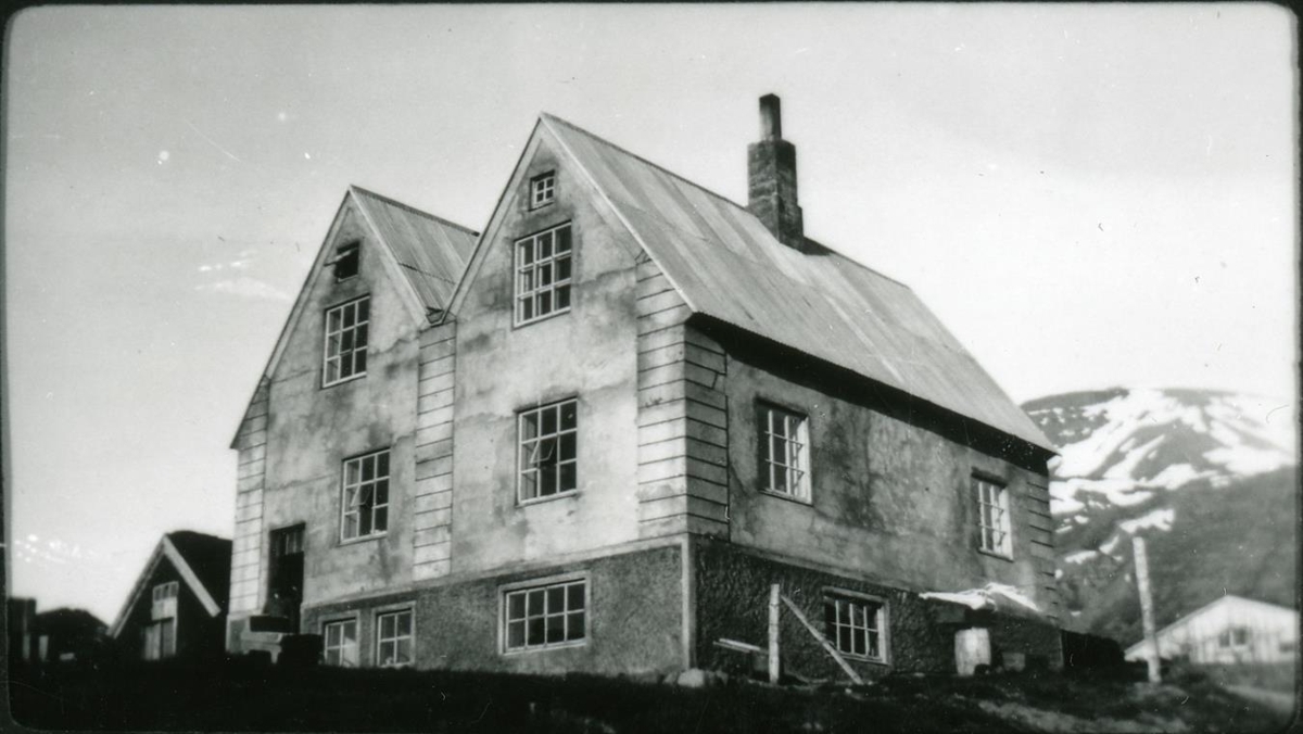 Eftirtökumynd. Í forgrunni er reisulegt,