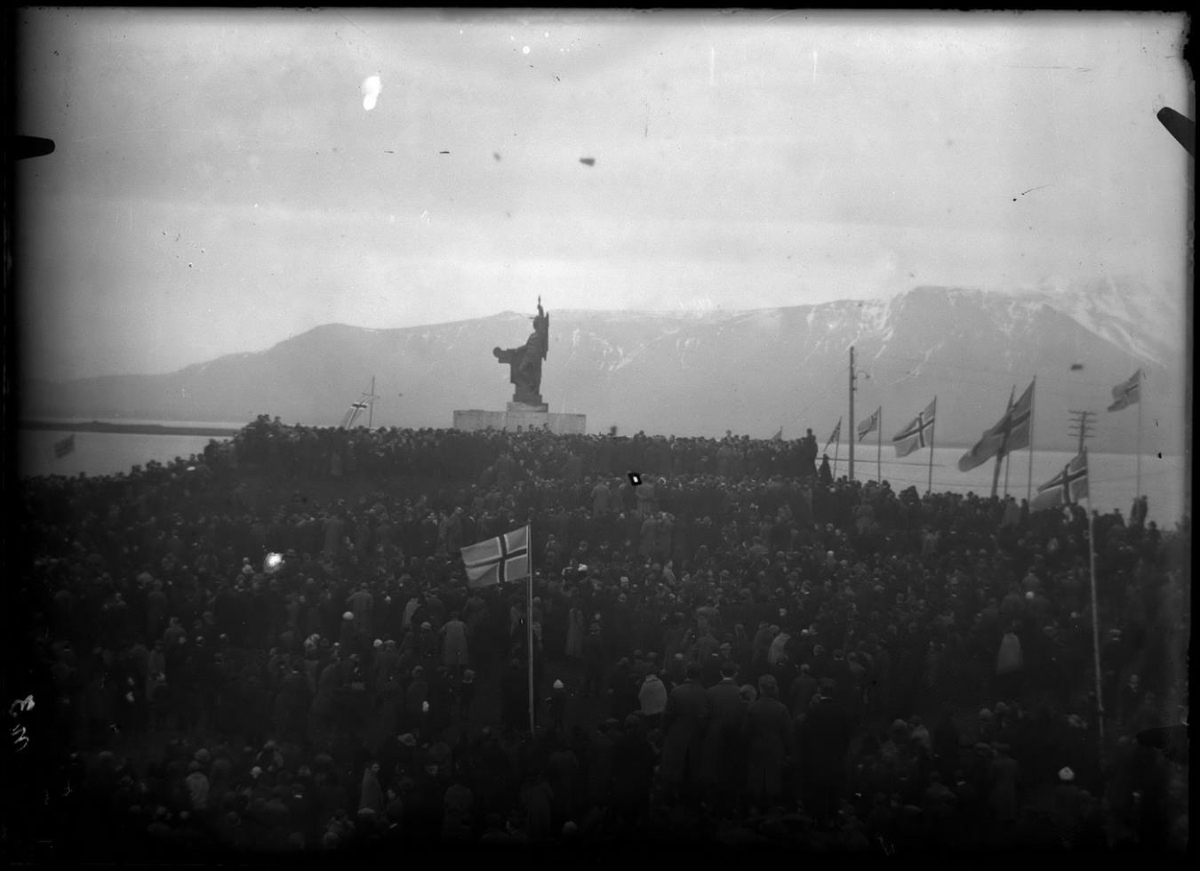 Mannfjöldi á Arnarhól við vígslu á styttu Ingólfs Arnarsonar.