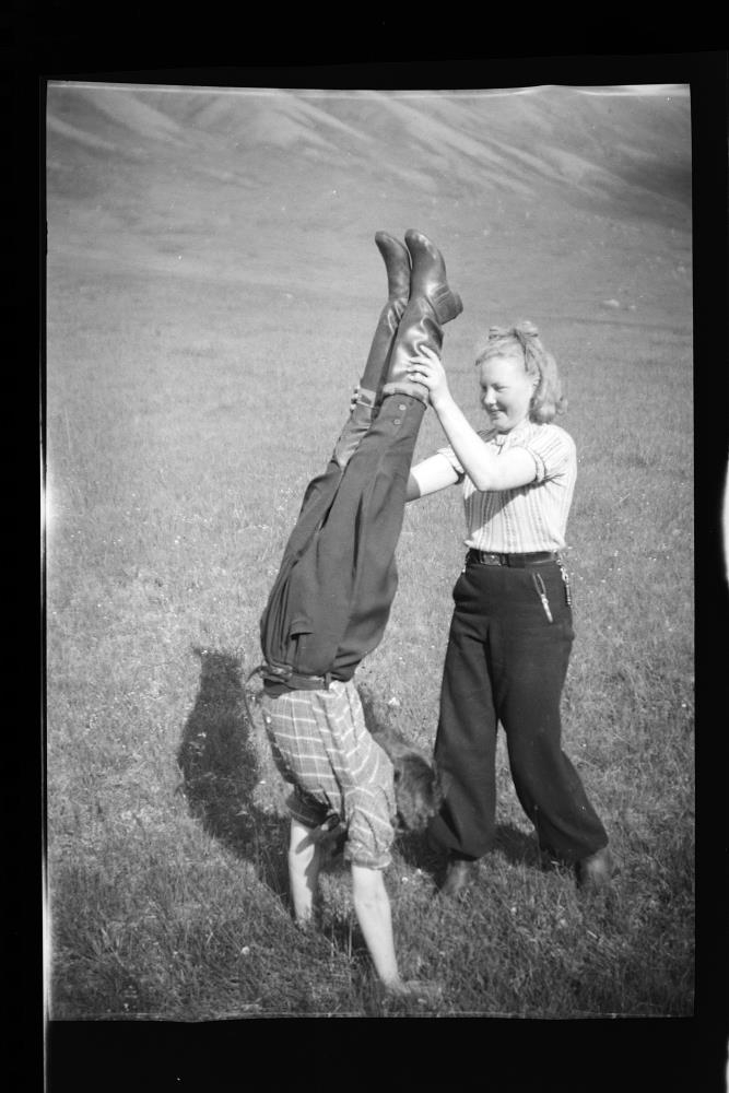 heldur í fætur hennar. Guðrún Hjartar og Inger Schiöth.