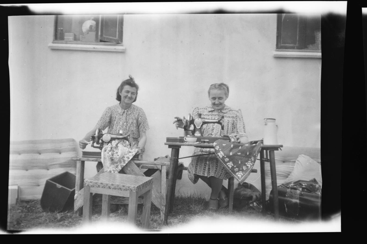 að sauma á saumavélar úti undir húsvegg. Kaffikanna á öðru saumavélaborðinu.