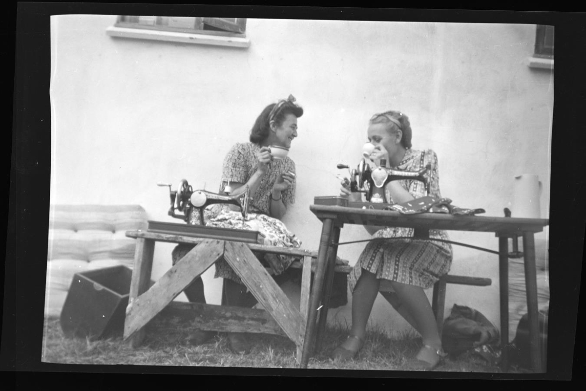 að drekka kaffi úr bollum sitjandi við saumavélar úti undir húsvegg. Kaffikanna