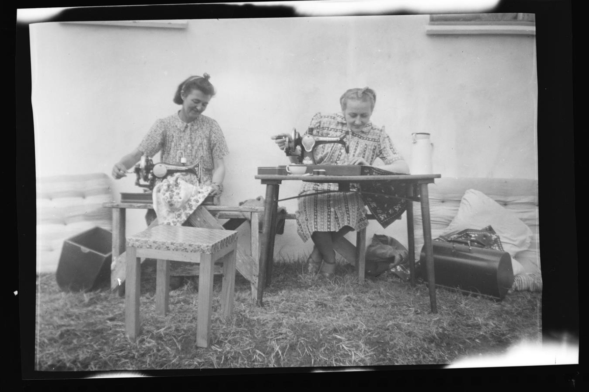 að sauma á saumavélar úti undir húsvegg. Kaffikanna á öðru saumavélaborðinu.