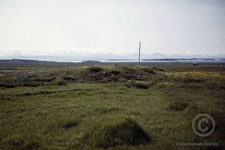 Kumlið er í hólnum rétt t.v. við staurinn, þar sem moldarbarðið er.