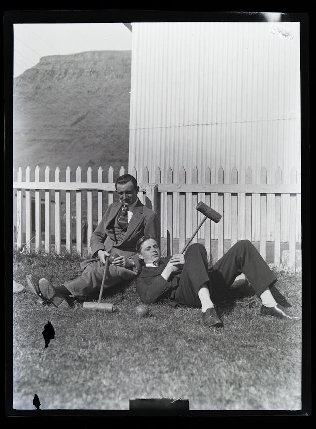 í jakkafötum sitja í grasi með krokketkylfur í hendi. Kúla liggur hjá.