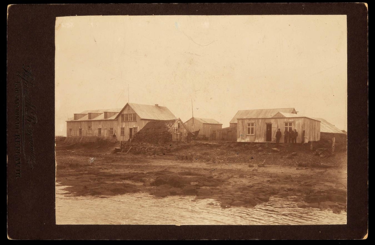 stort bárujárnsklætt timburhús og þrjú minni. Torfhús. Menn undir húsvegg.