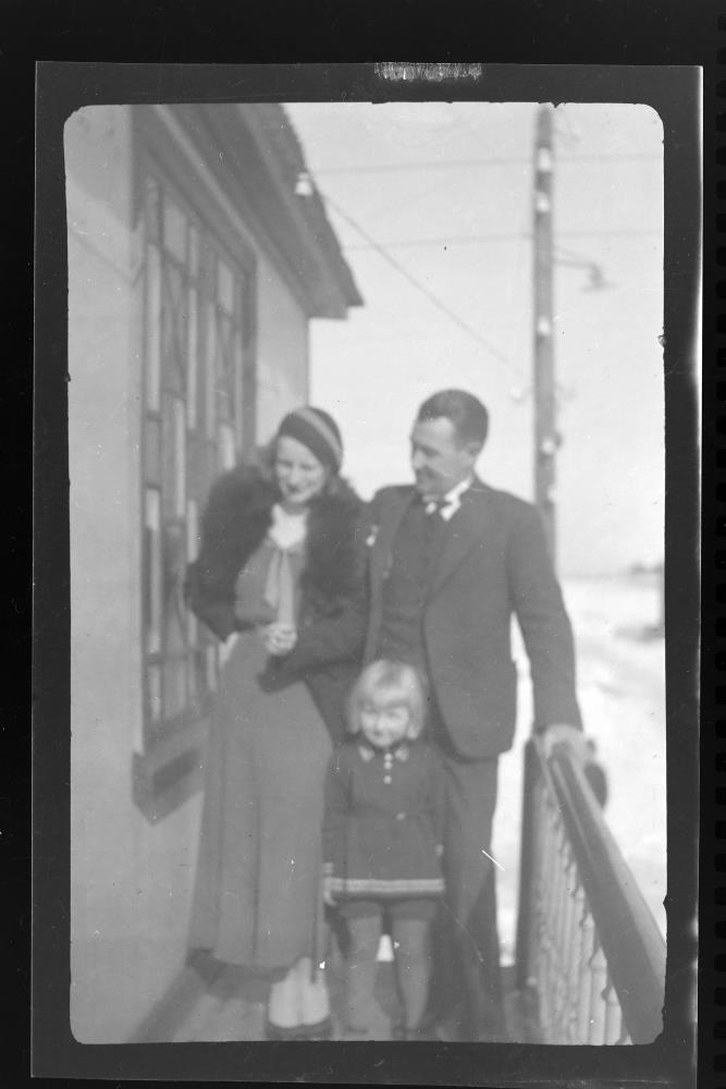 kona og barn á stigapalli við hús. Dóróthea.