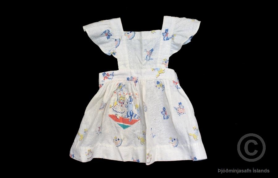 Barnasvunta, smekksvunta, úr hvítu bómullarefni með myndum af köttum við ýmsar „mannlegar“ athafnir og í ýmsum klæðnaði. Myndirnar eru í bláum, gulum, bleikum og grænum litum. Svuntan er með böndum yfir axlir sem þræddar eru í gegnum lykkjur á endum mittisstrengs. Böndin eru svo bundin saman í mittið að aftan. Pífur á öxlum. Á suntunni framanverðri er einn vasi. Svuntan er mjög lítl, enda var hún saumuð á gefanda þegar hún var um eins árs gömul. Svuntuna saumaði móðursystir hennar, Þuríður Guðjónsdóttir frá Kýrunnarstöðum (f. 1905).