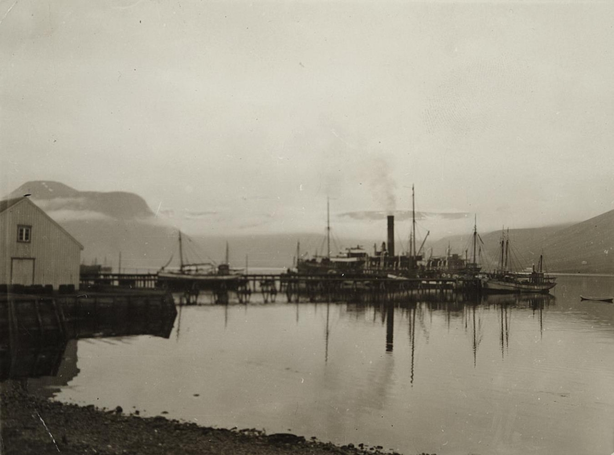 Gufuskip og/eða seglskip á höfninni við bryggjusporð sem gengur fram í sjó fyrir miðri mynd, pakkhús á bryggju til vinstri. Fjallgarður í baksýn. Aftan á mynd er skrifað: Sigló, ljósm. óþ