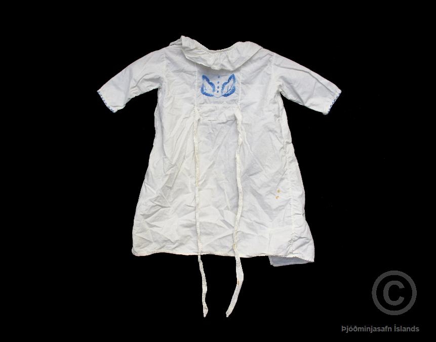 Lauertukjóll, vöggukjóll, úr hvítu lérefti með útsaumi, bláum laufblöðum, á brjósti. Með sama útsaumsgarni er saumað fremst á ermum. Kjóllinn er í mjög góðu ástandi en á honum eru örfáir blettir. Móðir gefanda, Svava Guðjónsdóttir frá Kýrunnarstöðum í Dalasýslu (f. 1903), saumaði kjólinn á börn sín.