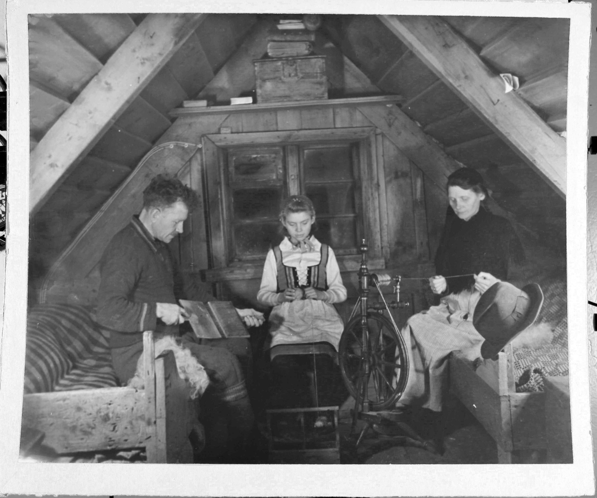 Innan úr baðstofunni á Stóra-Ási í Hálsasveit. Maður að kemba ull. Situr á rúmi. Kona situr andspænis honum á rúmi og er að spinna á rokk. Stúlka situr á milli þeirra með hnykil. Hattur á rúmstólpa. Kistlar á hillu yfir glugga á gafli.