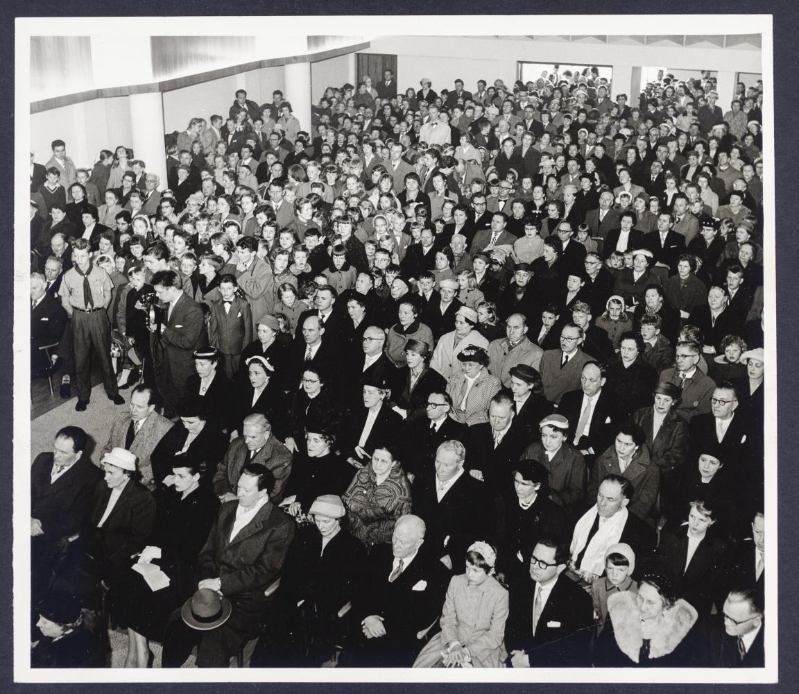 prúðbúnu fólki. Greina má Gunnar Thoroddsen á fremsta bekk. Við myndina
