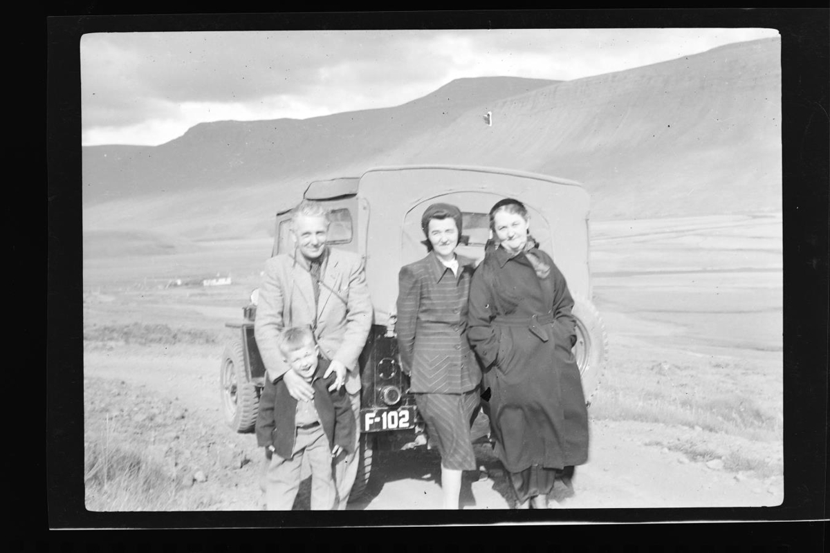 við jeppa. Einar, Ólöf og systir hennar Ingibjörg Briem og Kristján Bogi