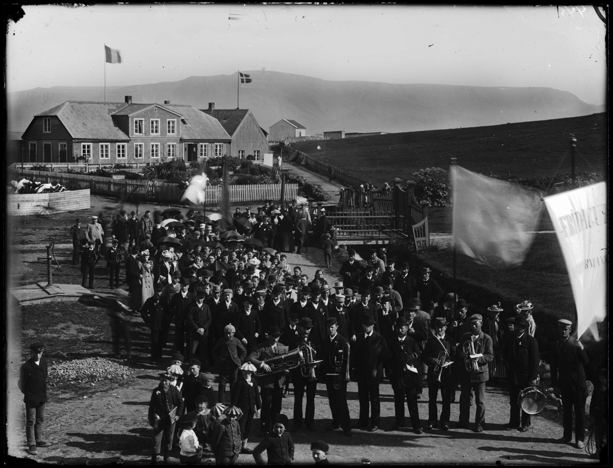 Hópur fólks með hornaflokk í broddi fylkingar og tvo fánabera. Fólkið uppábúið og sumir með regnhlíf. Lækur, vatnspóstur timburhús með afgirtum skrúðgarði ofl. Í bakgrunni má sjá Siemsenshúsið við Hafnarstræti 23.