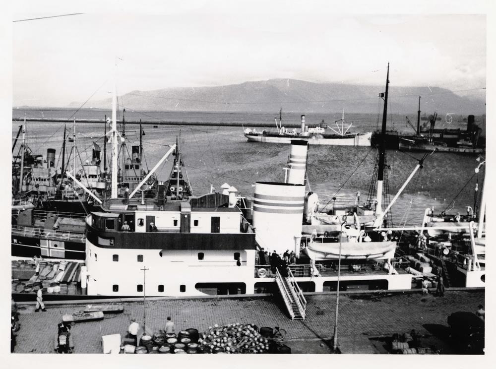 „Strandferðaskip íslenska ríkisins við bryggjuna; Esja (II) nær. Súðin utan á henni. Þrír vopnaðir breskir togarar utan við þau með íslenskan togara frá útgerðarfélaginu Kveldúlfi yst á þeim. Hinumegin í höfninni er flutningaskipið Hekla sem þýskur kafbátur sökkti 1941.“ (BÞ 2013)