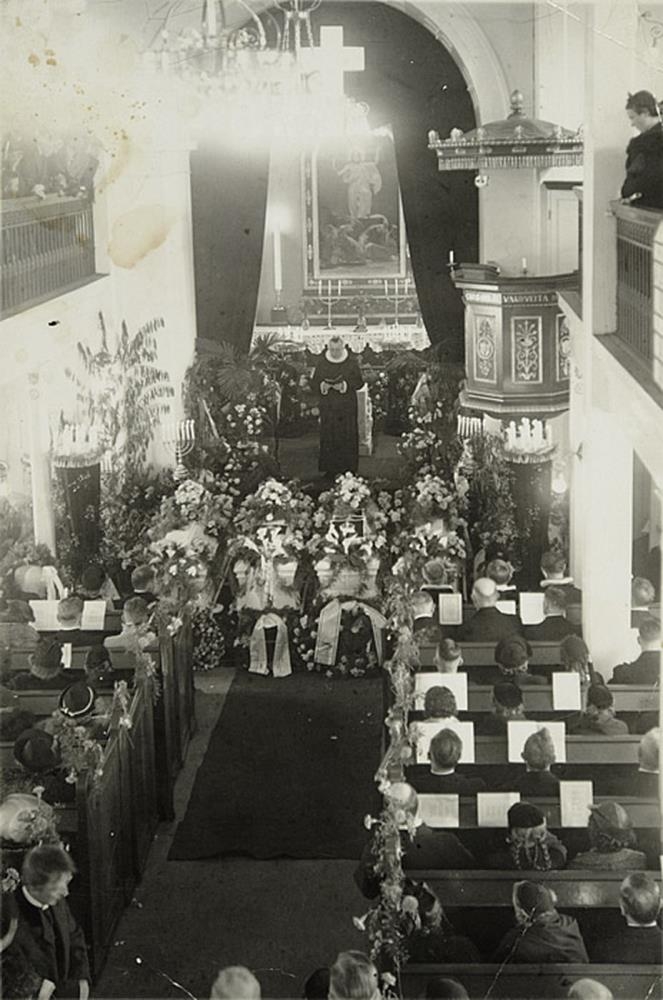 og krönsum, standa á börum á kirkjugólfi, prestur stendur handan við þær