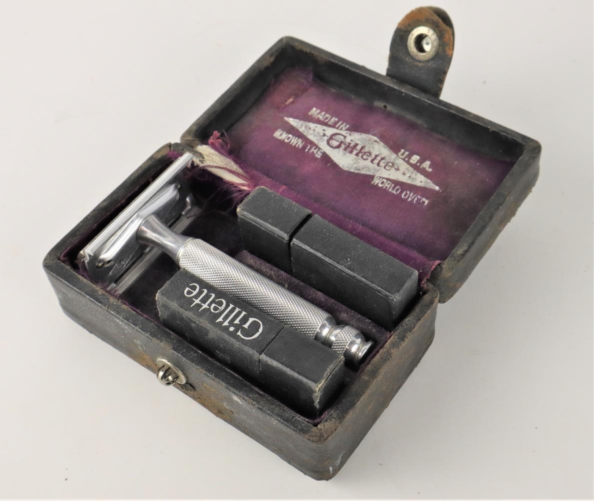 Lítil askja sem lokast að framanverðu með smellu. Í henni er rakvél og tvö hylki fyrir rakvélarblöð. Askjan er klædd með fjólubláu fóðri.