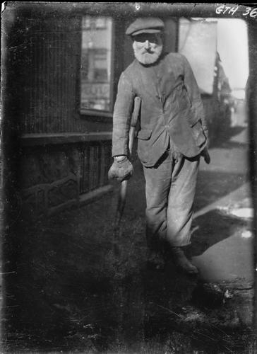 Karlmaður við götuhreinsun í vinnufötum með skóflu.