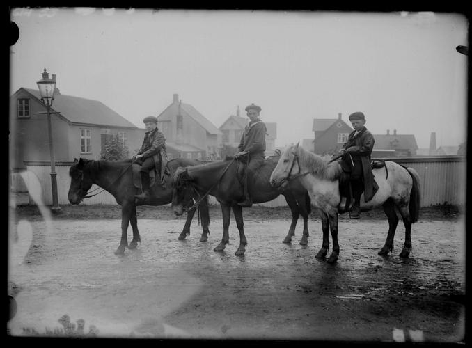 Þrír strákar á hestum. Einn þeirra er á matrósafötum en tveir