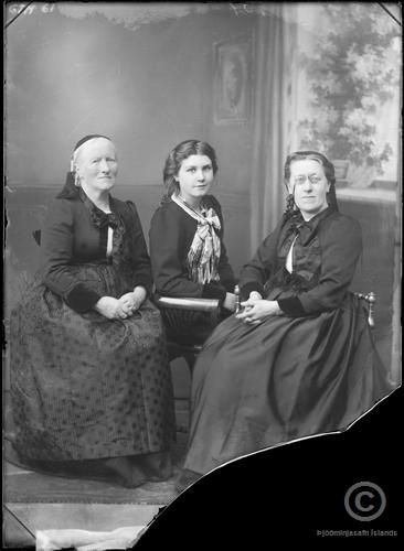 61. Þrjár konur í peysufötum. Þrjár kynslóðir kvenna. Ágústa Snorradóttir Svendsen kaupkona, Ólöf Björnsdóttir (f. 1887) og Henriette Louise Henriksdóttir Svendsen (1859-1919) kona Björns Jenssonara kennara.