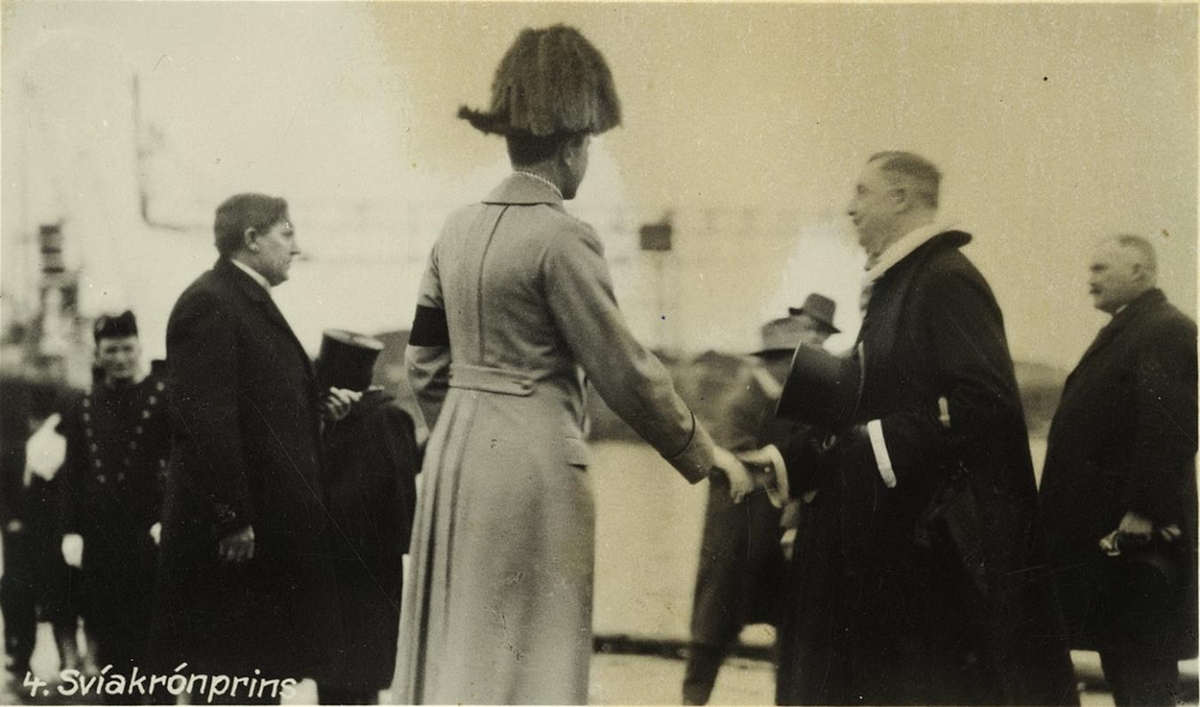 Nokkrir karlmenn í síðum kápum heilsast, í bakgrunni grillir í láréttan lyftikrana. Neðst t.v.: 4. Svíakrónprins.