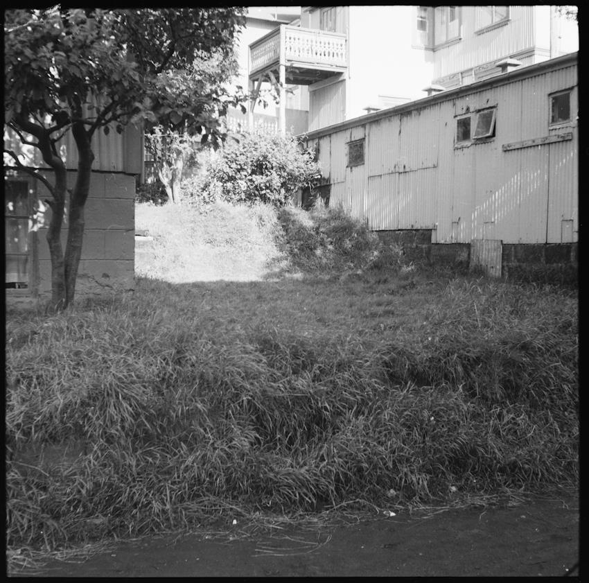 Brattagata 3A bakhlið og skúr. Gróður á milli húsa er í forgrunni