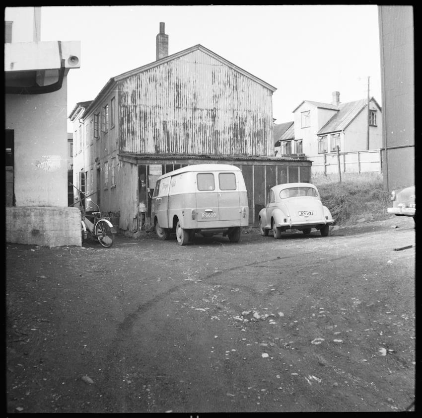 Úr Grjótaþorpi í Reykjavík 1962. Tvílyft bárujárnsklætt timburhús alveg uppí steinsteyptu húsi. Fischersund 1 og í baksýn Mjóstræti 8 eða 8b. Seinsteypta húsið sem sér í er Morgunblaðshöllin við Aðalstræti. Upp við húsið eru tveir bílar, rúgbrauðssendibíll og Fólksvagen bjalla.
