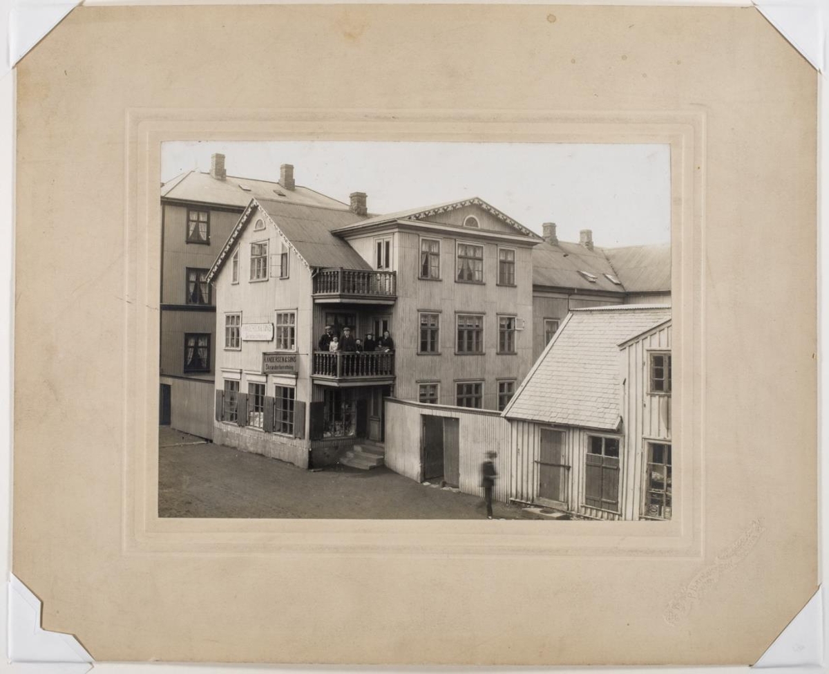 Stórt þrílyft timburhús með svölum við efri hæðirnar. Á svölum 2. hæðar stendur hópur fólks. Aðalstræti 16. Kæðskeraverkstæði H. Andersen & søns. Myndin er tekin eftir 1902. Fjölskylda Andersens á svölunum. T.v. Uppsalir og t.h. Aðalstræti 14, upphaflega spunastofa Innréttinga. Hans Andersen lengst t.v. en Helga kona hans lengst t.h. Hans dó ca. 1905-1917.
