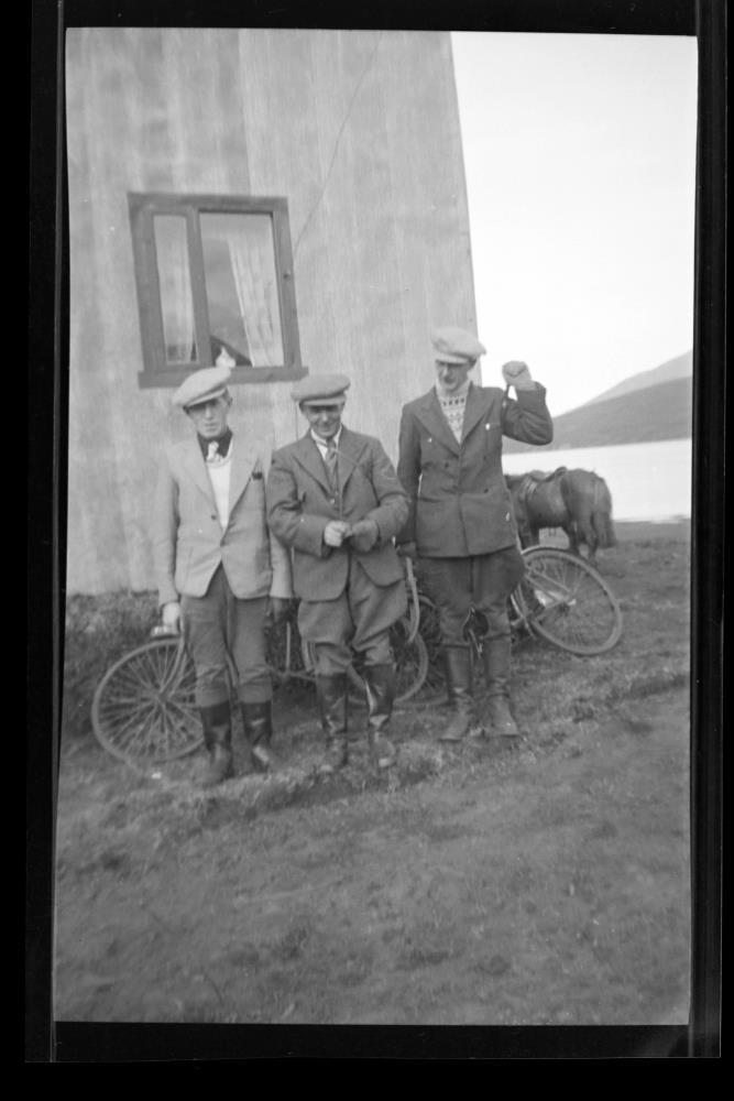 menn og hjól upp við húsvegg. Ingimundur Guðmundsson, Hanna Schiöth, Bogi
