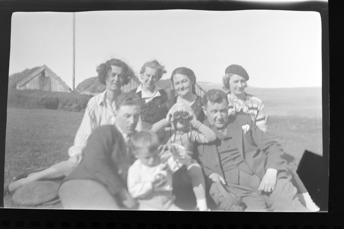 Melstaður. Miðfjörður. Hópur fólks situr á túni með torfæ í baksýn.