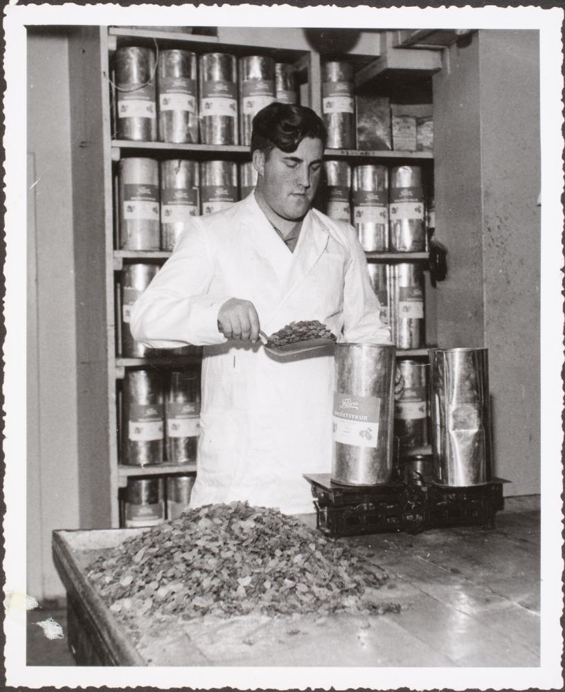 Níels Halldórsson verðlagseftirlitsmaður á Akureyri, starfsmaður sælgætisgerðarinnar Flóru, viktar brjóstsykur.