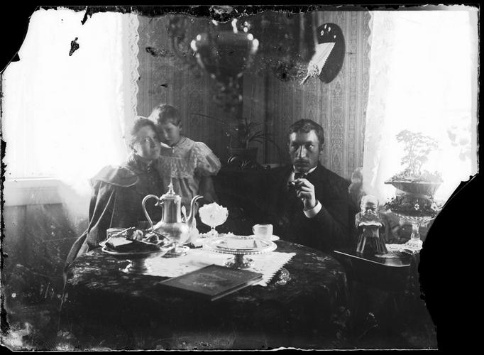 maður með stúlku sitjandi við borð í stofu. Maðurinn er með pípu