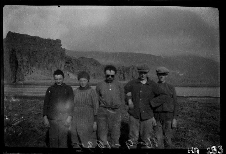 Kvískerjafólk á engjum í Stórusvæðu, f.v. Sigurður, Guðrún yngri, Björn Pálsson, Ari og Flosi.