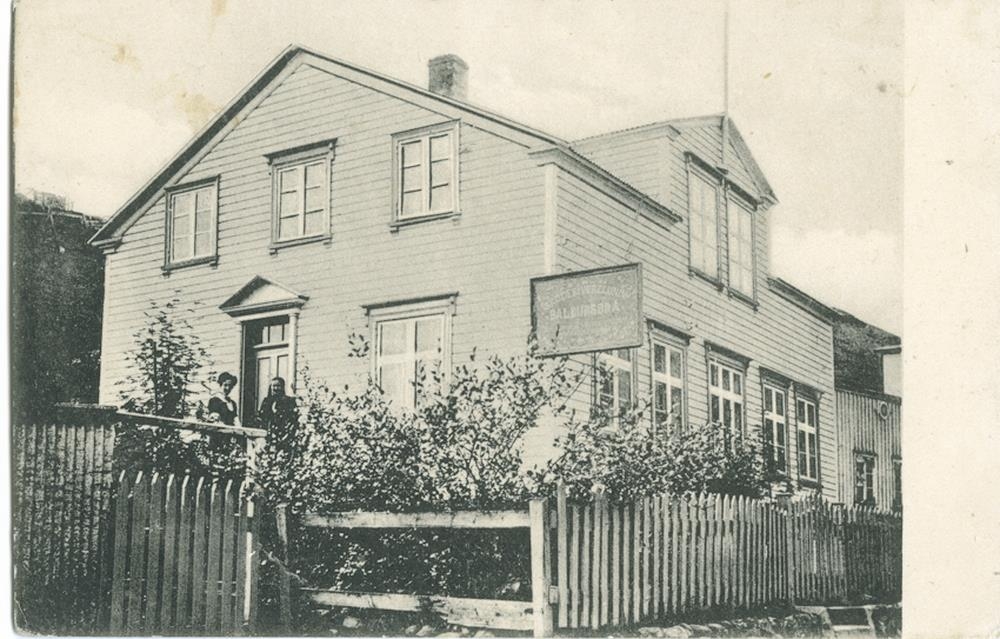 Hús Önnu Magnúsdóttur ljósmyndara og móður hennar, Marselíu Kristjánsdóttur, sem standa á tröppum að inngangi húss. Fremst á mynd er grindverk utan um garð hvar fyrir innan er runnagróður. Hús er reisulegt einlyft timburhús, sennilega með hlöðnum kjallara, með stóru háu risi sem á eru þrír gluggar á gafli og aðrir tveir á framhlið undir súð. Á skilti við framhorn fyrstu hæðar stendur að hér sé að finna verslunina Baldursbrá. Aftan á mynd stendur: Hús Önnu Magnúsdóttur og Marselíu Kristjánsdóttur Þær mæðgur standa á tröppunum.