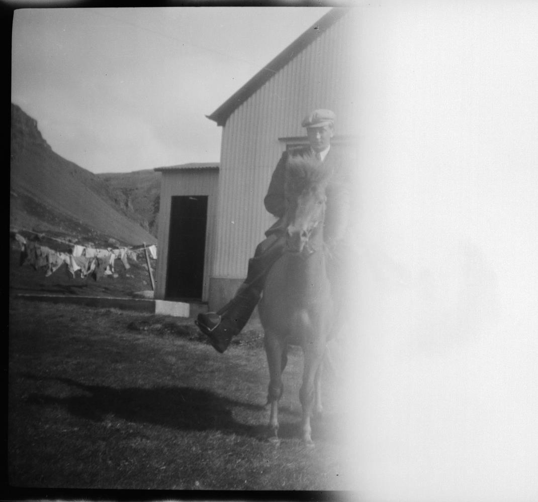 Maður á hesti við hús. Finnur Kristjánsson.
