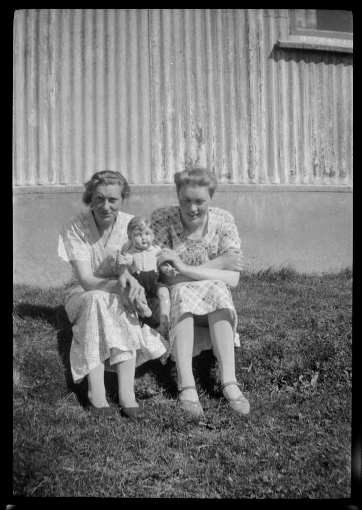 undir húsvegg með dúkku á milli sín. Inigbjörg og Ingigerður Kristjánsdætur.