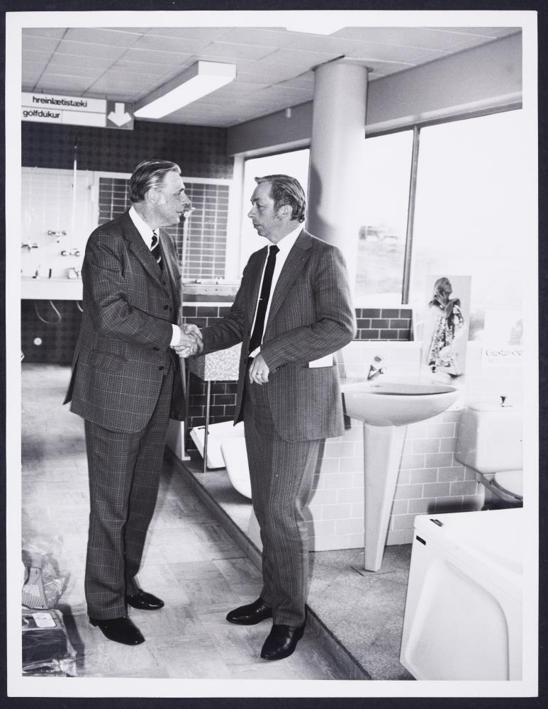 Ýmislegt. Hjalti Pálsson framkvæmdastjóri Sambandsins afhendir Helga Bergs formanni Viðlagasjóðs hreinlætistæki og kranasett fyrir 10 salerni.