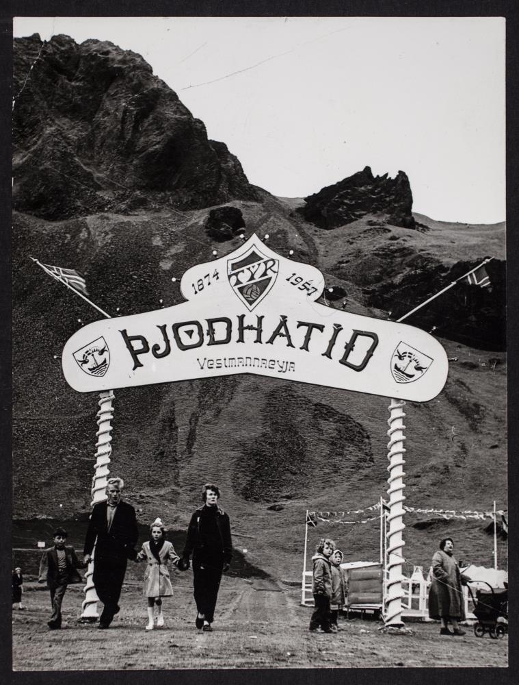Fjallshlíð í baksýn. Myndatexti er „Þjóðhátíðarhliðið í Herjólfsdal.“