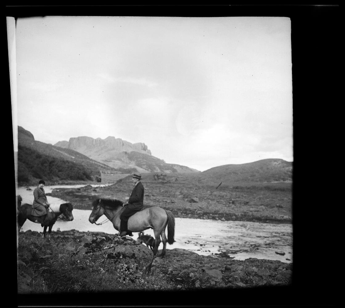 Maður og kona á hestum við á. 1936. Á ferð með Jóni stóð á umslagi líklega
