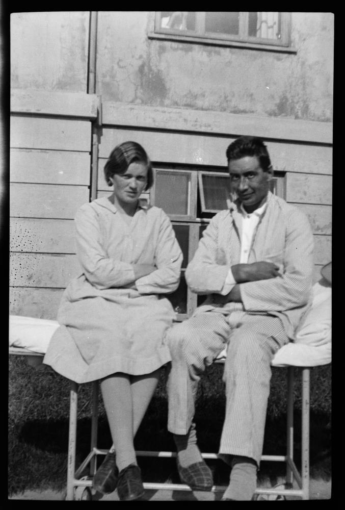 framan við steinsteypt hús. Landspítalinn. Ingibjörg Kristjánsdóttir og