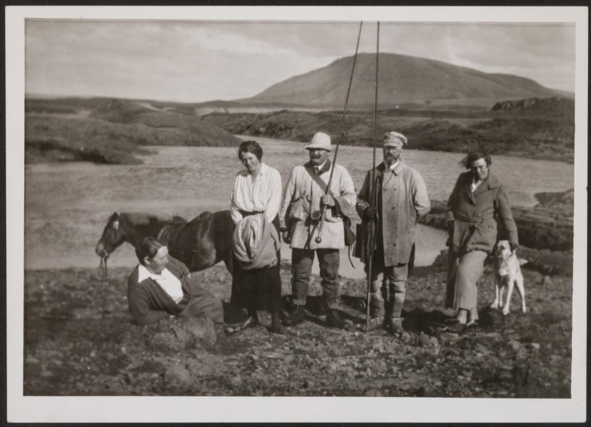 Úr veiðiferð. F.v. Ellen (kona Matthíasar E.), Svava (kona Halldórs), Halldór Vilhjálmsson á Hvanneyri, Matthías Einarsson, Sigríður Björnsdóttir (Björns Jenssonar). Á mynd má einnig sjá hest og hund, veiðistangir. Konurnar í pilsum. Grímsá í Lundarreykjadal.