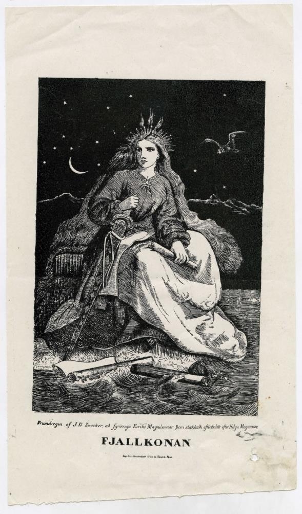 Uppdráttur eftir Helga Magnússon sem hann gerði eftir Fjallkonumynd J.B. Zweckers, sem gerð var fyrir atbeina Eiríks Magnússonar bókavarðar í Cambridge.