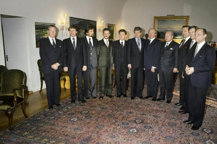 Víð mynd af ríkisstjórn Gunnars með Forseta Íslands á Bessastöðum. Stjórnin