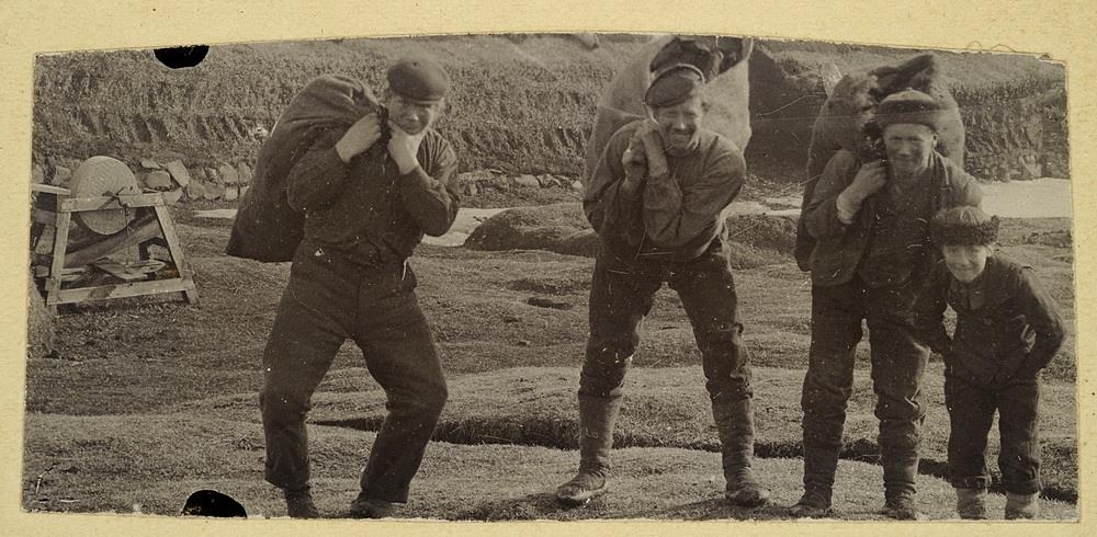Drengur fylgist með. Hverfisteinn og torfveggir í baksýn.