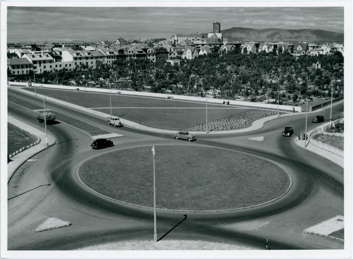 Hringtorg í forgrunni. Bílar á ferð. Sér í kirkjugarð með vaxandi trjágróðri í baksýn íbúðarbyggð og kirkja gnæfir yfir.