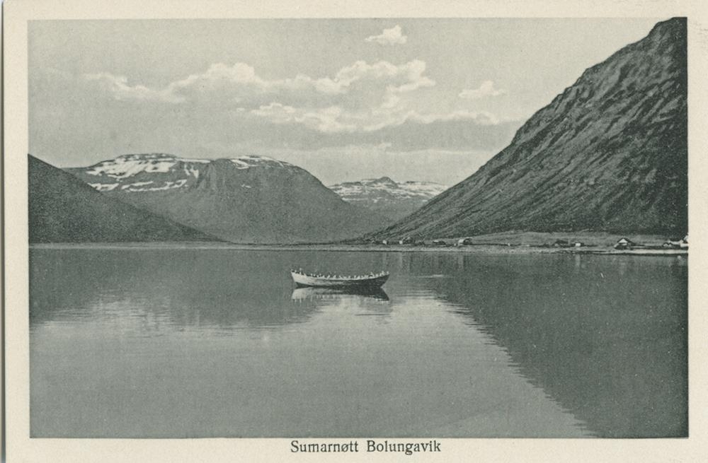 Í forgrunni liggur allstór árabátur við akkeri á spegilsléttum sjó, Í baksýn t.h. eru fáein hús á stangli undir hárri og brattri fjallshlíð. T.v. opnast inn í dal og fjalllendi.