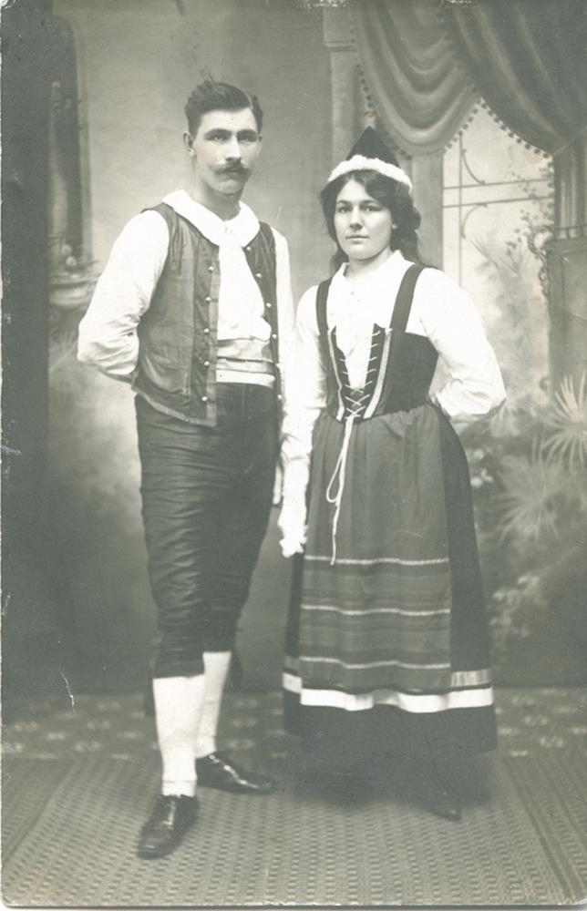 Karlmaður og kona, bæði á þrítugsaldri og í þjóðbúningum af einhverju tagi. Málaður bakgrunnur.