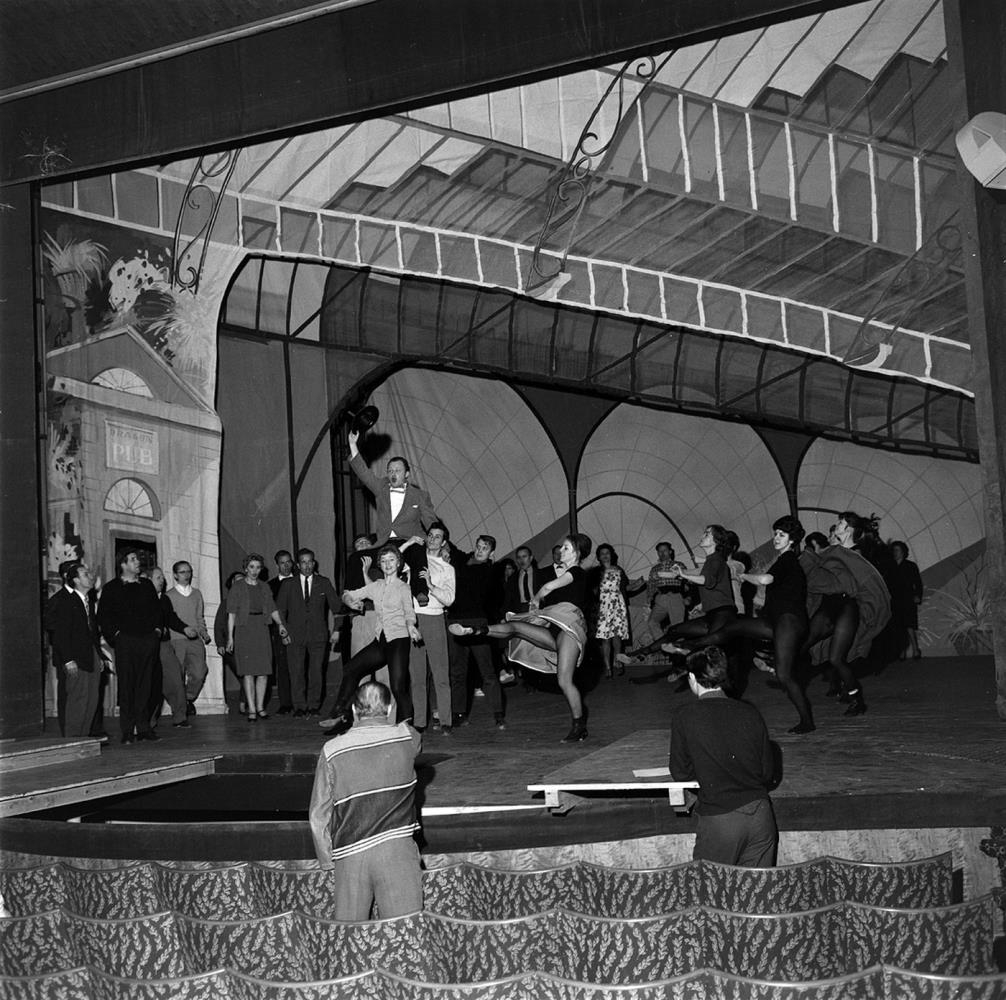 Leikæfing. Leikarar eru á sviðinu. Konur dansa. Tveir menn bera mann á öxlum sér. Tveir menn standa við áhorfendabekkina.